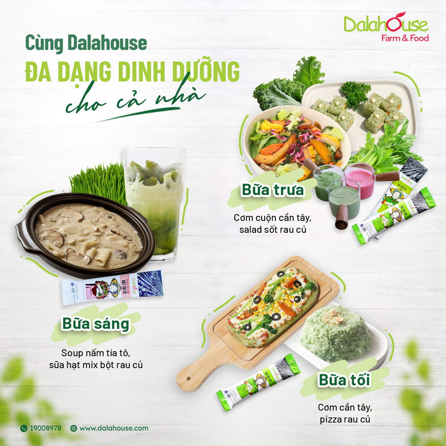 Sở hữu bộ sản phẩm Bột rau củ hữu cơ Dalahouse trong nhà cùng nắm giữ những công thức nấu ăn thú vị bên trên sẽ giúp bạn ăn chay một cách dễ dàng, tiện lợi và ngon miệng hơn. Bạn đã sẵn sàng tham gia lối sống ăn chay lành mạnh, khoa học để thêm đẹp da, eo thon, bụng khỏe, sức khỏe căng tràn cùng Dalahouse chưa?