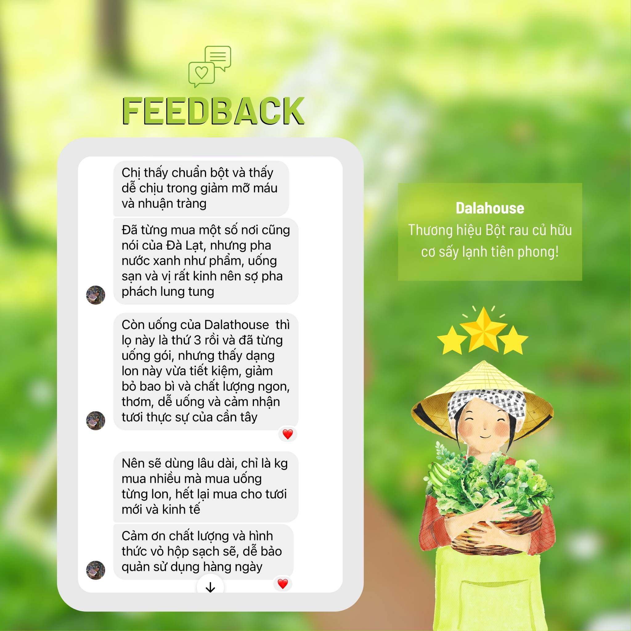 Phản hồi từ khách hàng về top 3 bột rau xanh chính là động lực to lớn giúp Dalahouse kiên định phát triển các dòng sản phẩm mang đến giá trị dinh dưỡng vượt trội, đáp ứng tiêu chí vừa cải thiện sức khoẻ vừa hỗ trợ da dáng một cách tự nhiên và chất lượng cao cho người tiêu dùng.