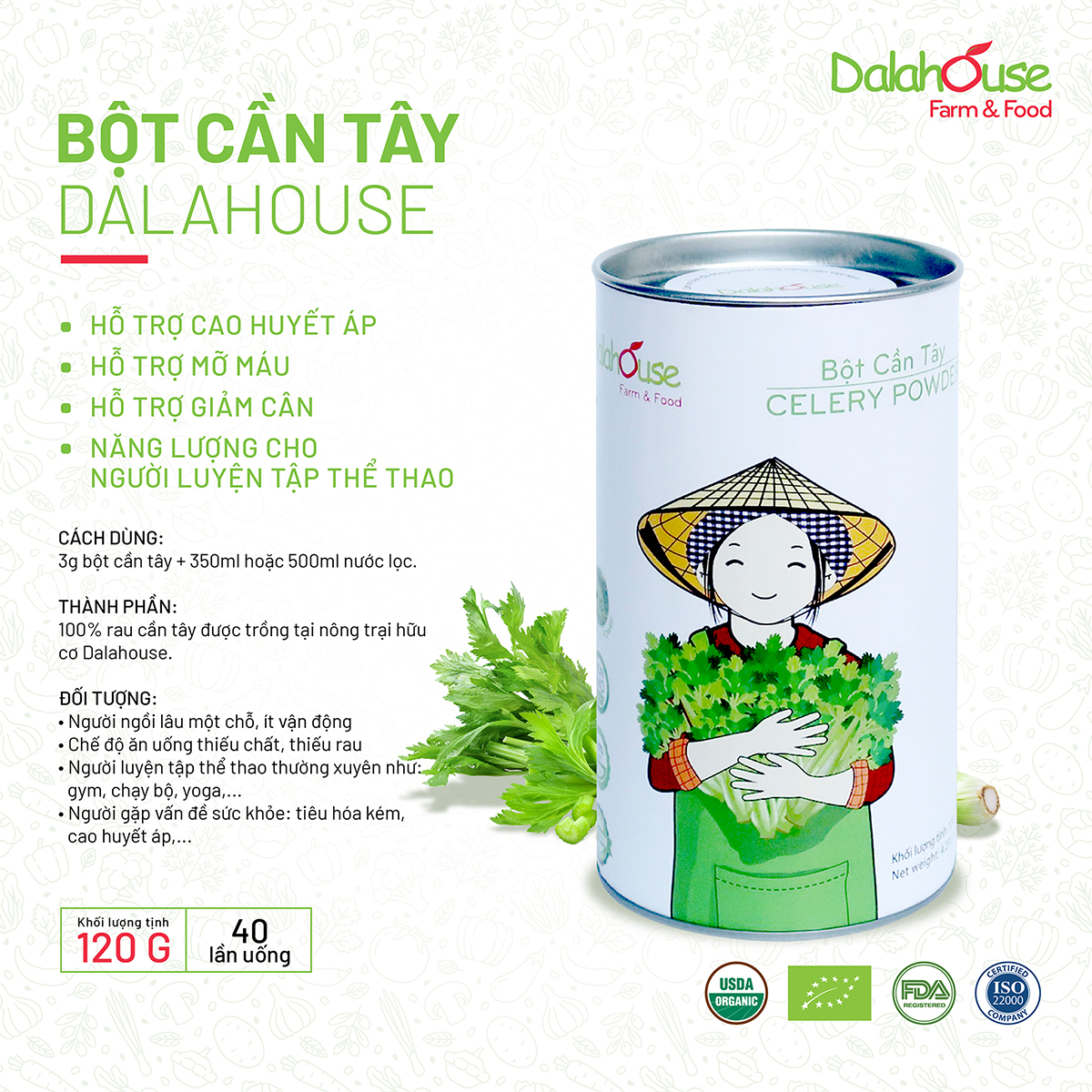 - Bột cần tây Dalahouse đạt chứng nhận hữu cơ quốc tế USDA và EU.