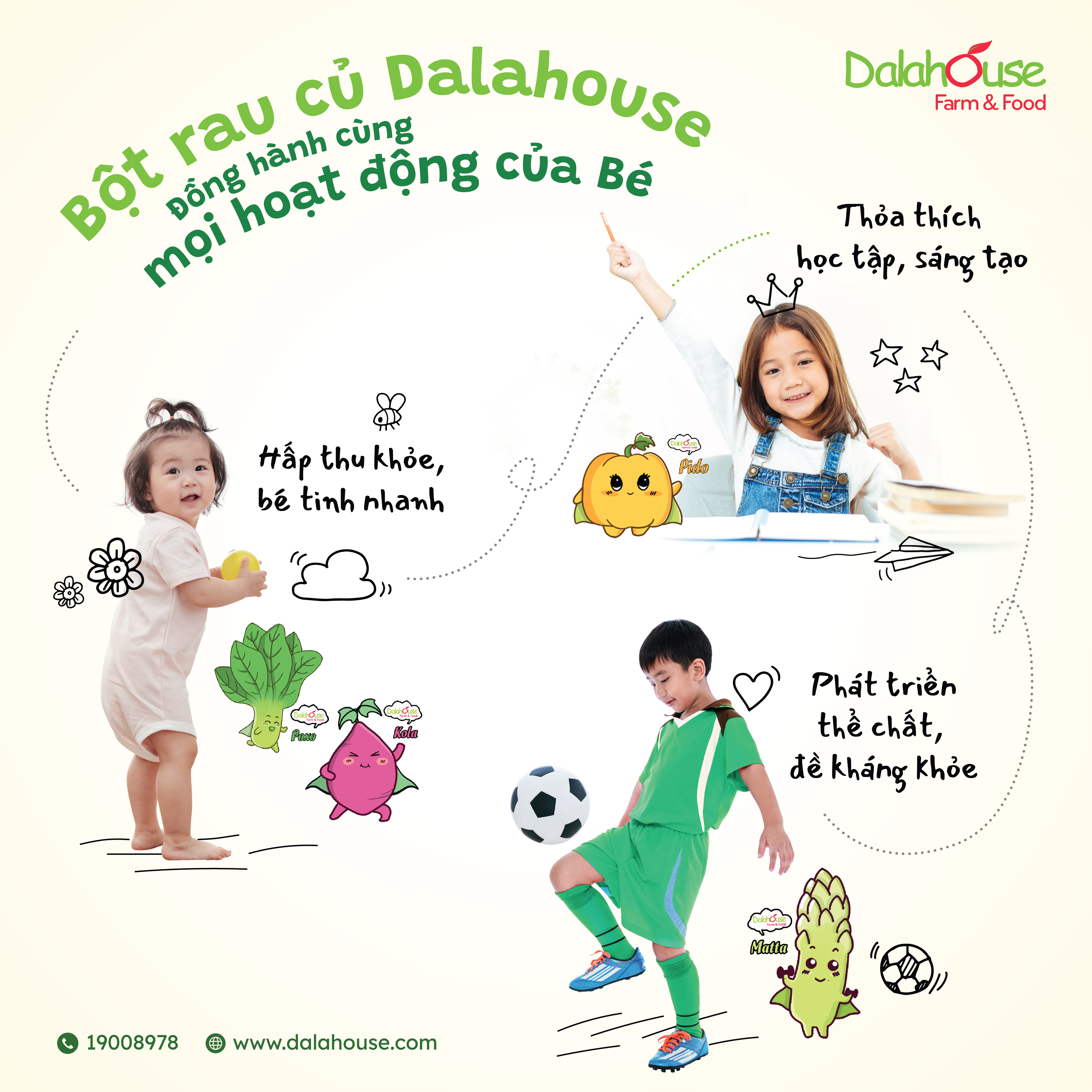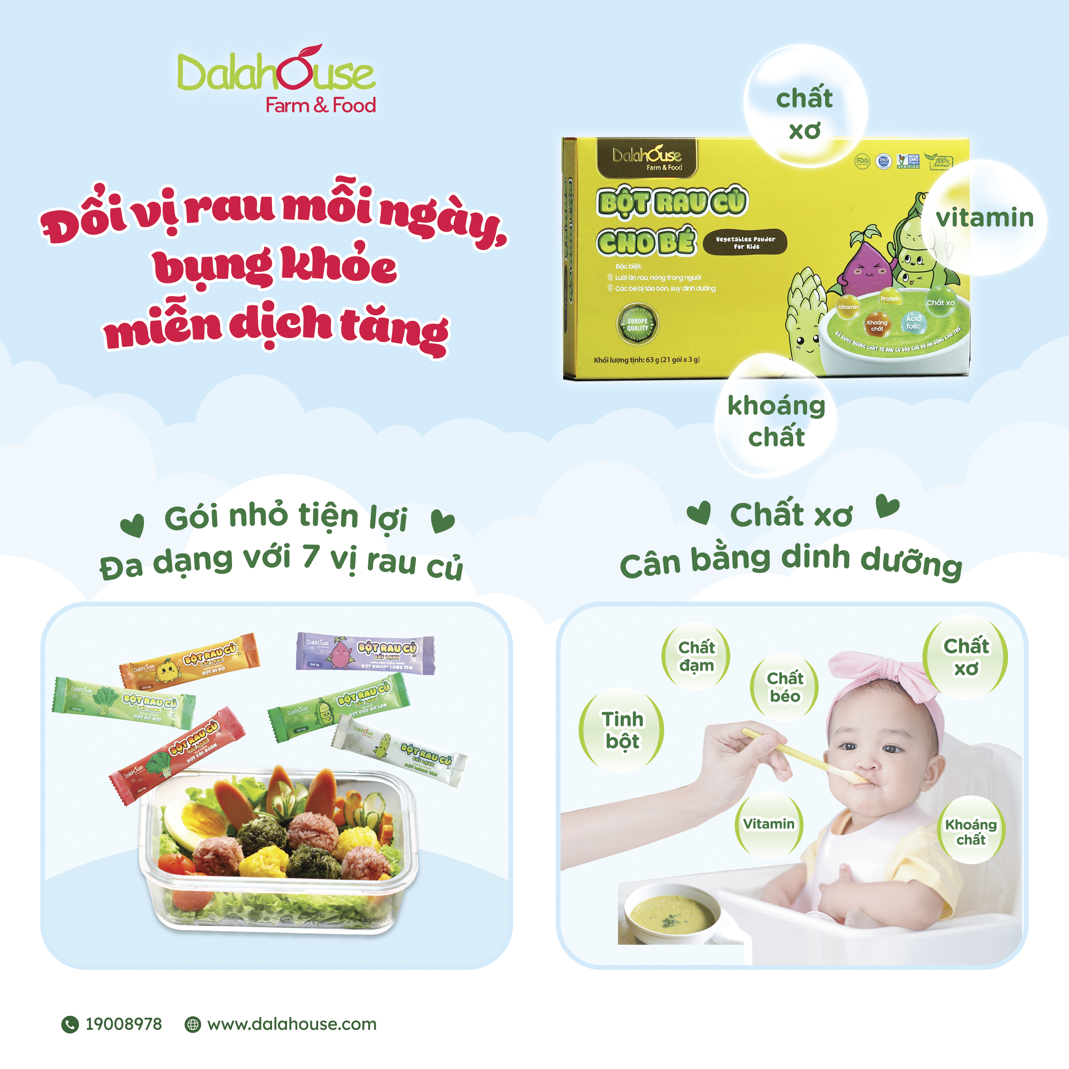 Bí quyết giúp mẹ tạo ra những bữa ăn đủ chất cho bé là tận dụng bột rau củ giàu chất xơ và dinh dưỡng tự nhiên trong bột rau củ. Những lợi ích khi mẹ chọn Dalahouse cho các bữa ăn của trẻ: