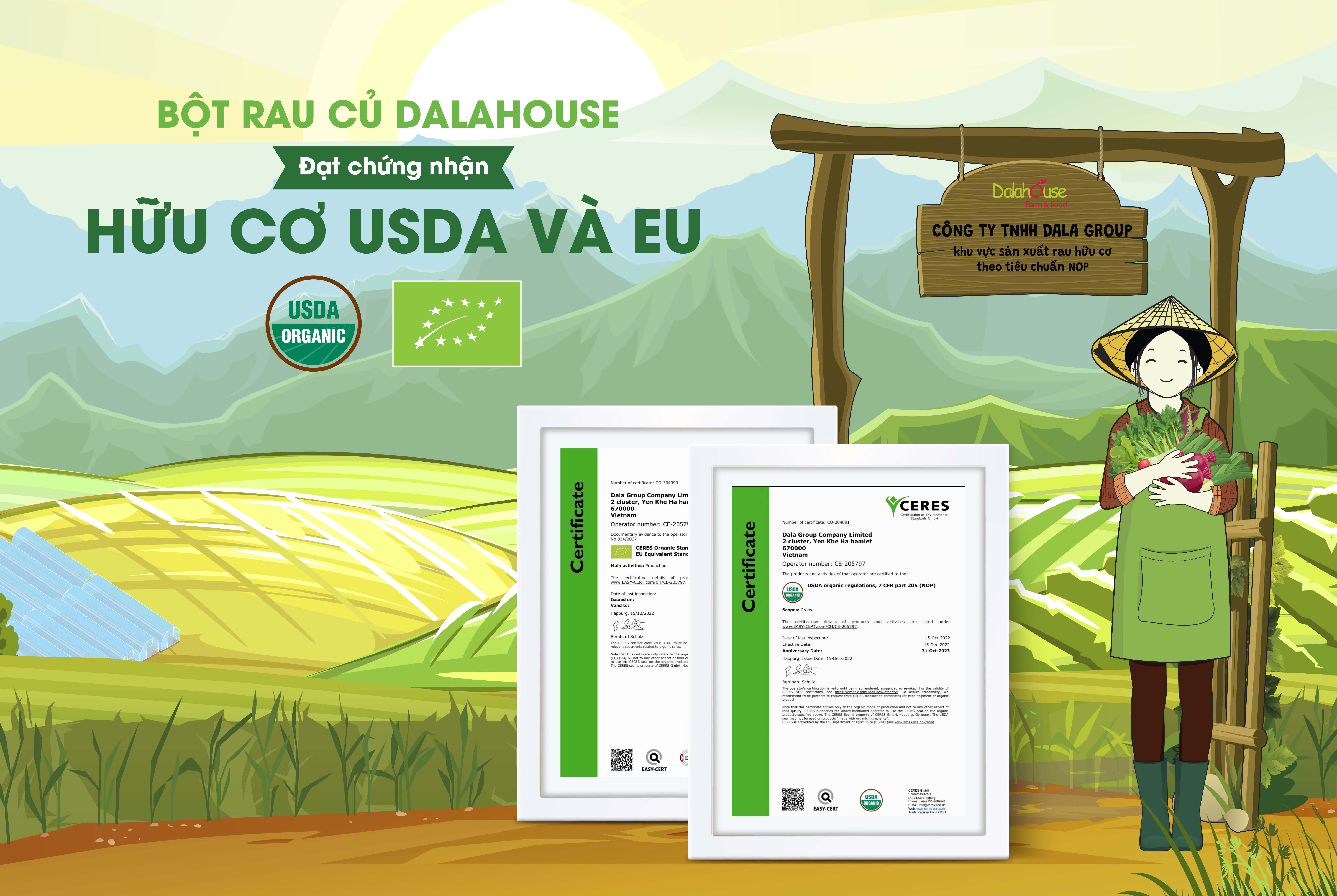 Bột rau củ Dalahouse đạt chứng nhận hữu cơ quốc tế USDA và EU