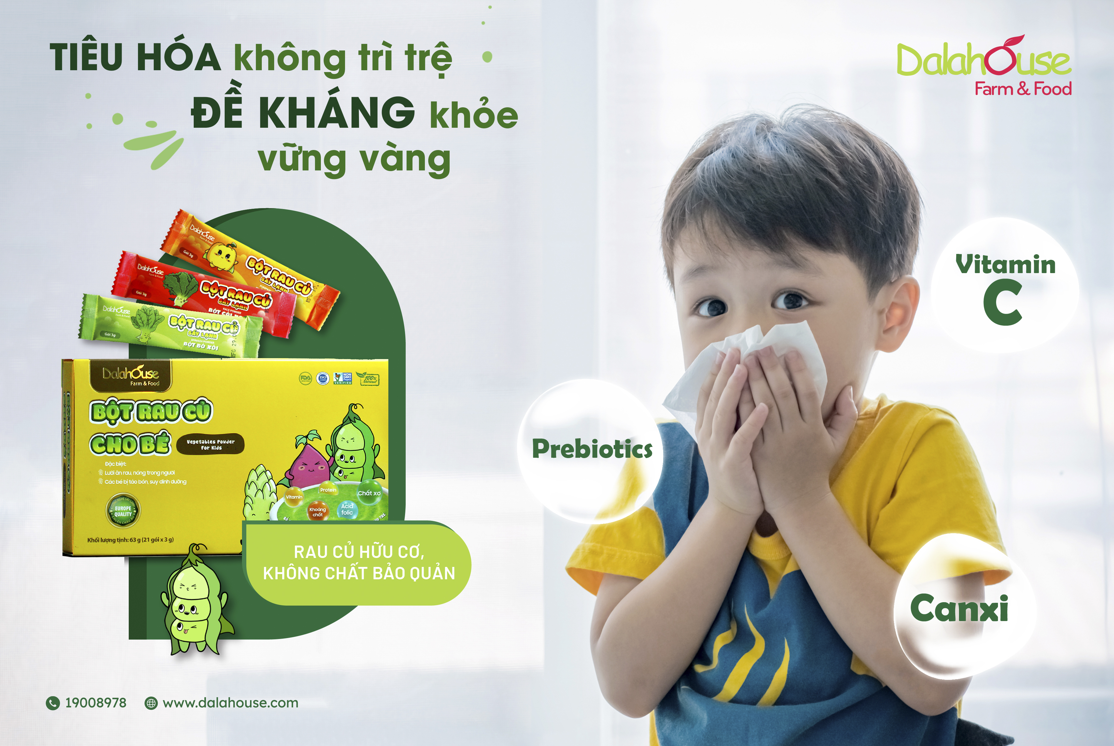 Dinh dưỡng trong giai đoạn đầu đời vô cùng quan trọng đối với sự phát triển toàn diện về thể chất và tinh thần. Bột rau củ cho bé Dalahouse giúp mẹ bổ sung rau củ vào bữa ăn của trẻ một cách an toàn và tiện lợi nhưng vẫn đảm bảo dinh dưỡng từ nhóm rau củ quả nhờ công nghệ sấy lạnh giữ đến 90% hàm lượng vitamin, khoáng chất và chất xơ tự nhiên từ nguyên liệu rau củ hữu cơ.