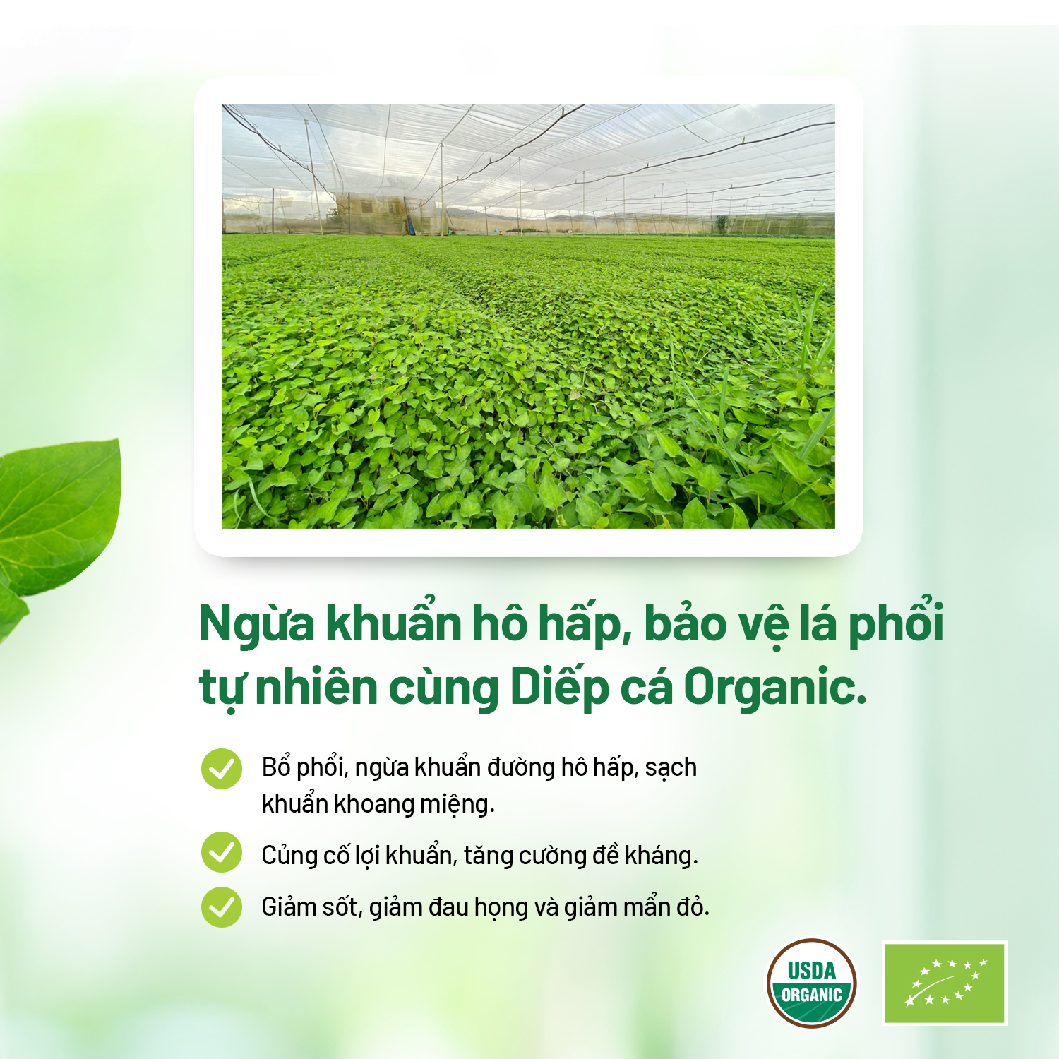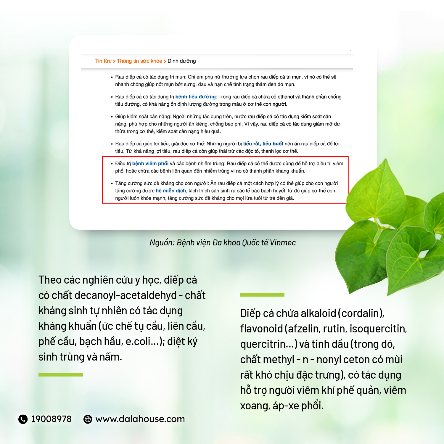 Củng cố hệ miễn dịch vô cùng cần thiết giúp phòng ngừa vi khuẩn gây hại tấn công gây hại đến hệ hô hấp và làm tổn thương đến chức năng của phổi. Bột diếp cá hữu cơ Dalahouse tiện lợi, dễ dàng pha nước diếp cá mà không mất thời gian và công sức chế biến, dù bận rộn nhưng vẫn bảo vệ hệ miễn dịch cũng như hệ hô hấp cho cả gia đình