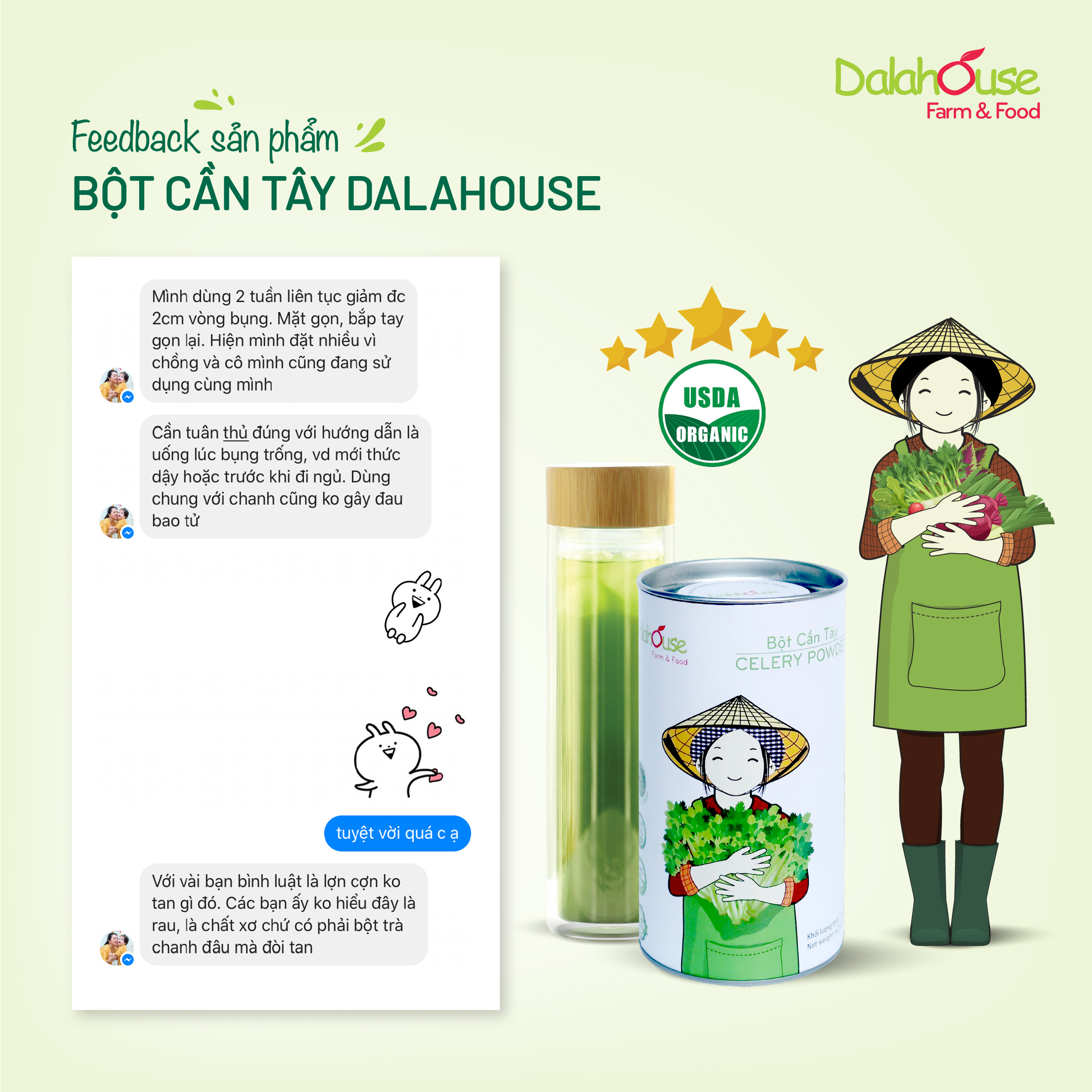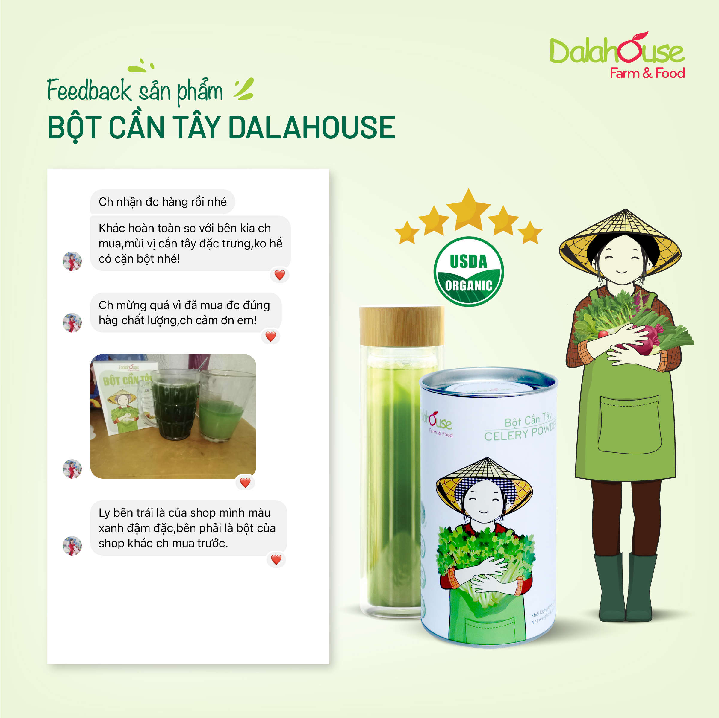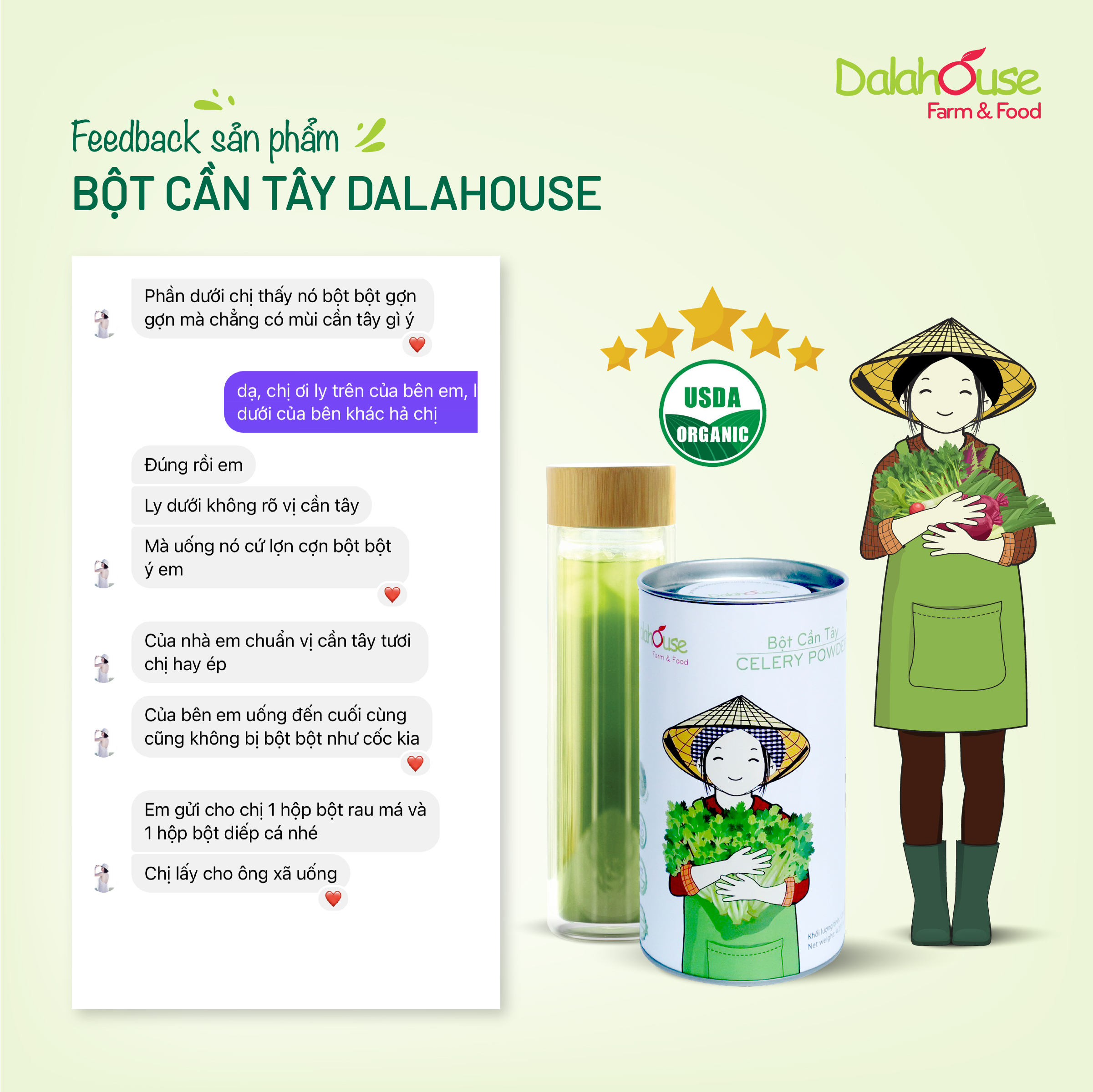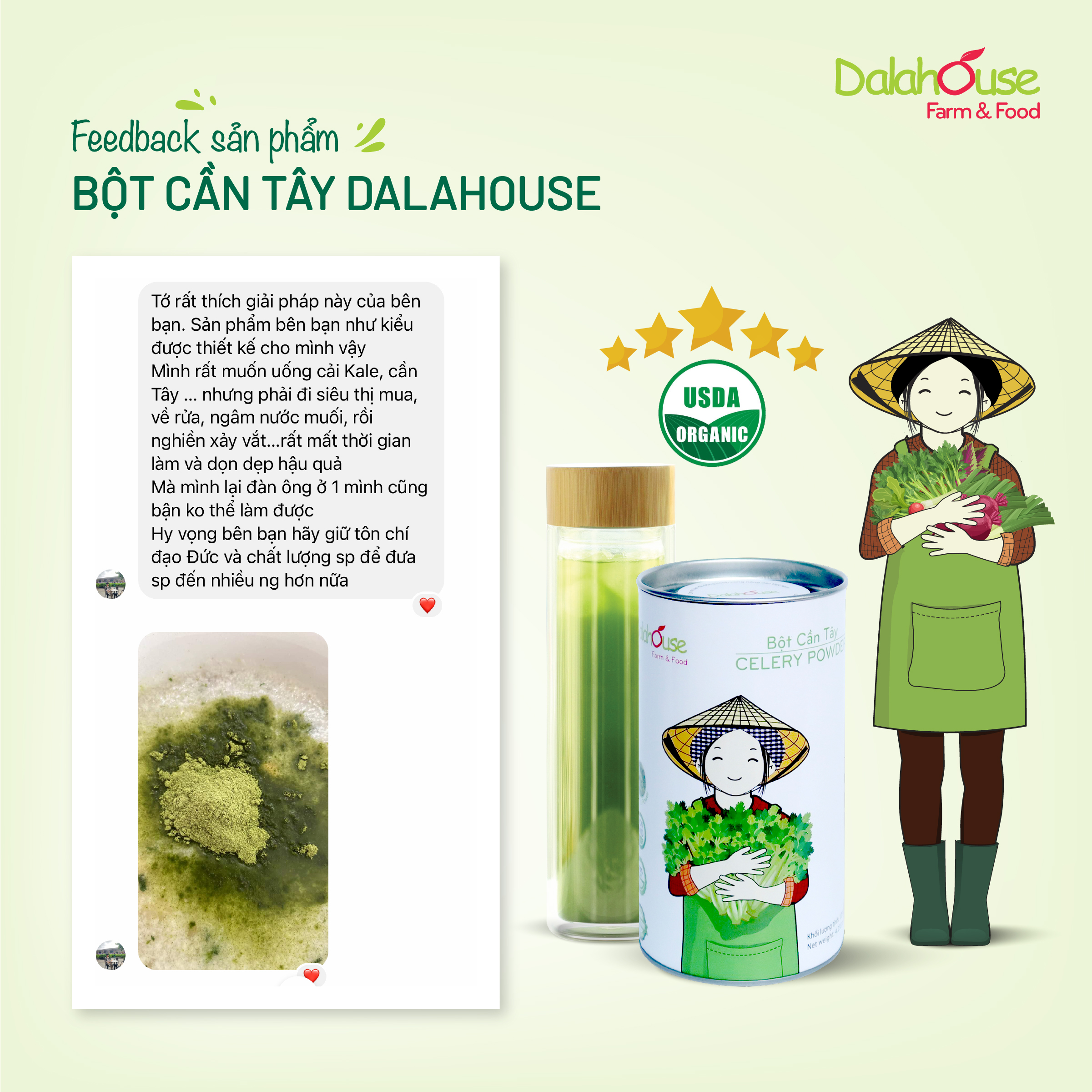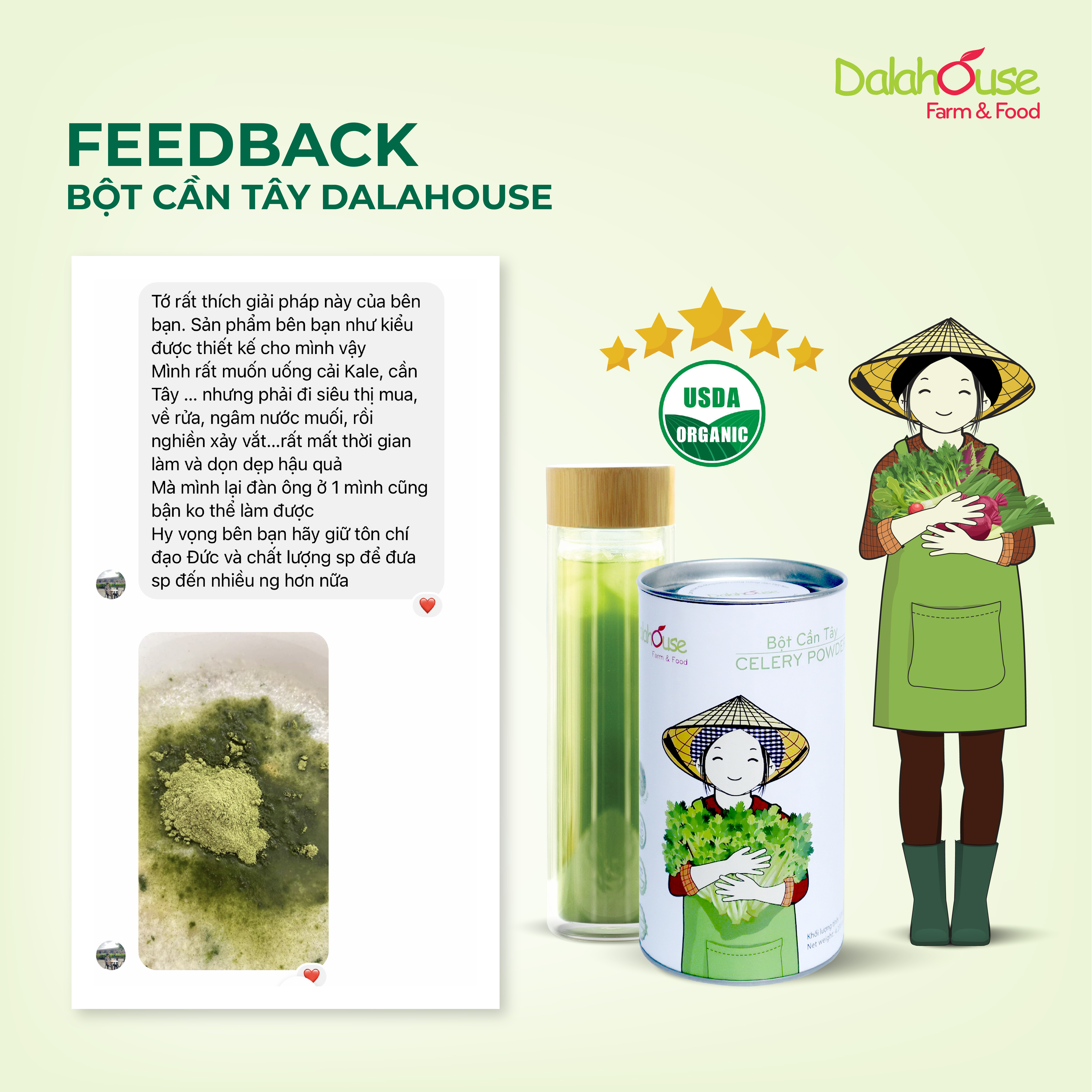Liên tục nhận được những phản hồi tích cực của khách hàng về sản phẩm bột cần tây chính là động lực giúp Dalahouse không ngừng nâng cao chất lượng sản phẩm và tiếp tục lan tỏa những thông điệp bổ ích đến nhiều khách hàng đang gặp vấn đề sức khỏe.