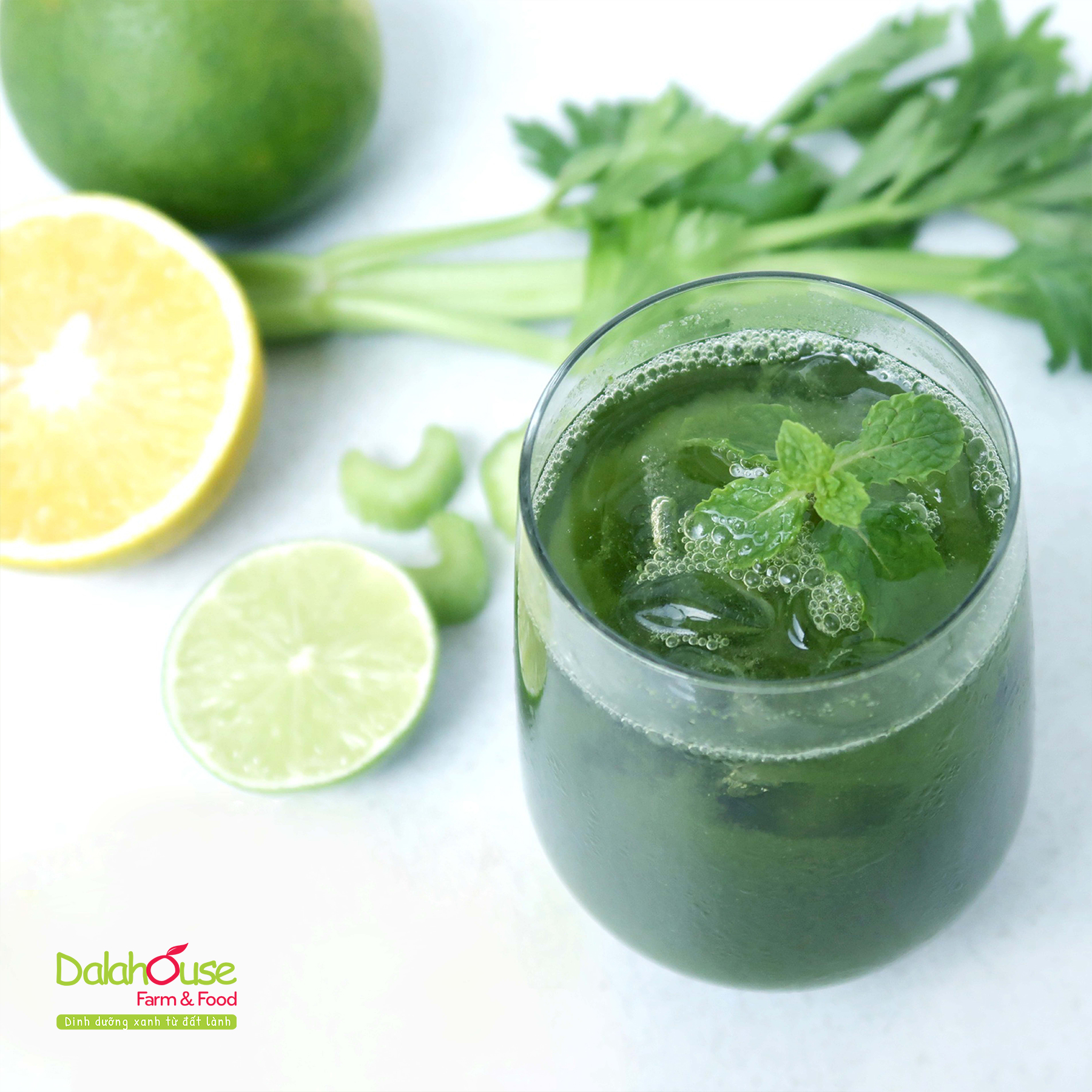 - Nguyên liệu hữu cơ: rau cần tây hữu cơ được canh tác tại nông trại Dalahouse nằm ở chân núi cao nguyên Lâm Viên.