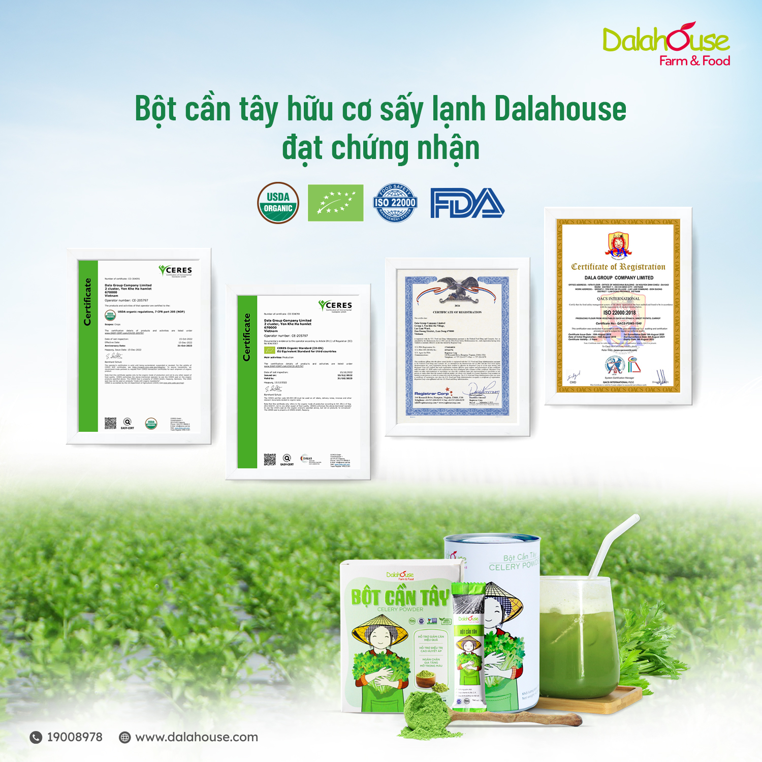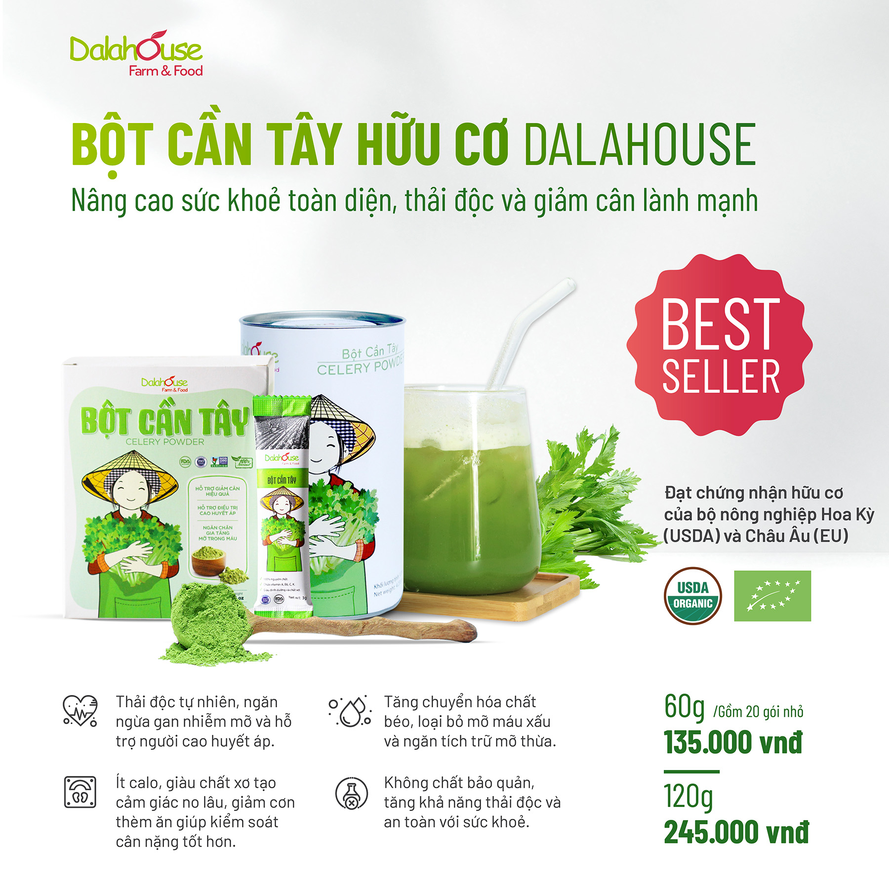 - Chứng nhận uy tín: bột cần tây Dalahouse đạt chứng nhận hữu cơ của Mỹ (USDA) và Châu Âu (EU).