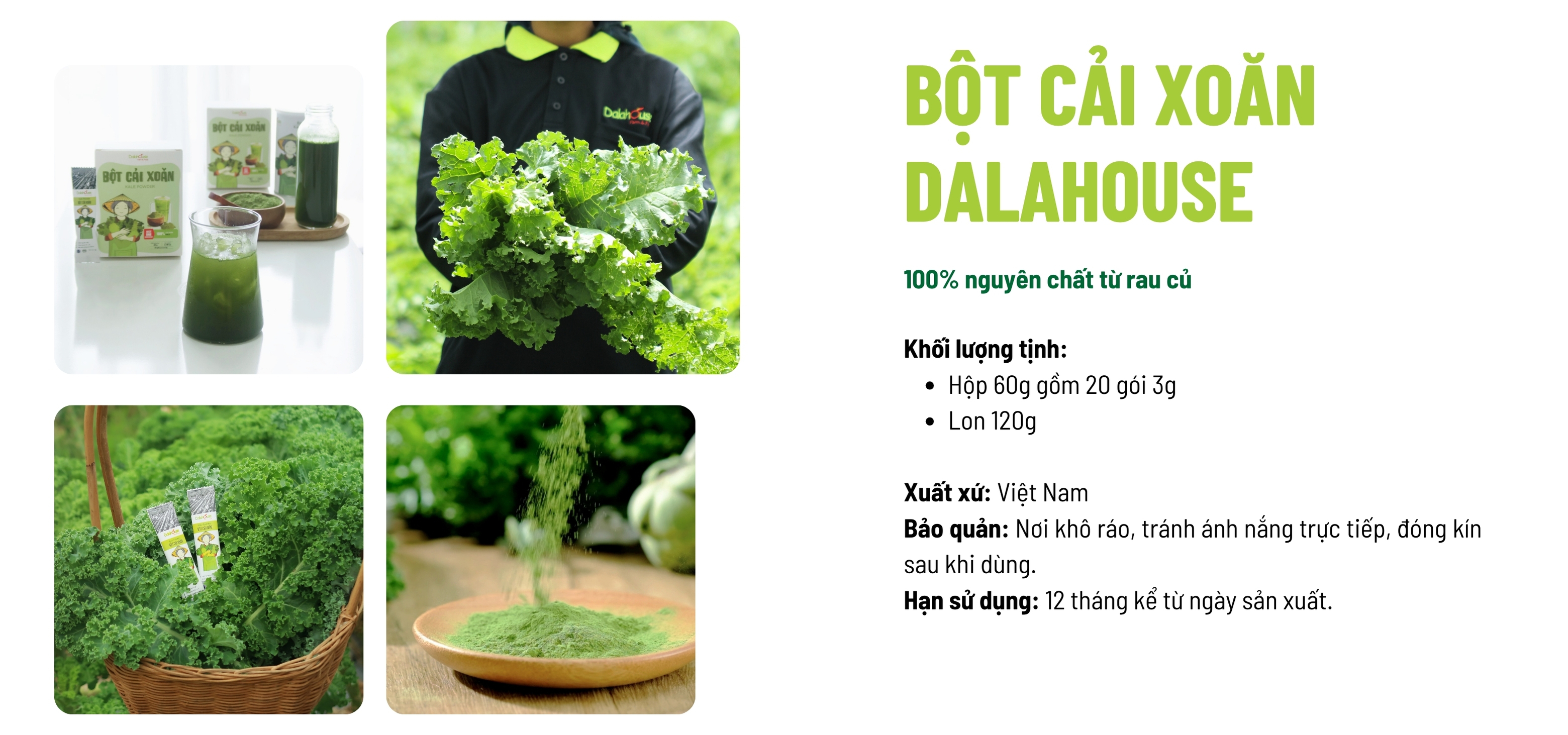 Bột Cải Xoăn Dalahouse tiện lợi cho lối sống bận rộn nhưng vẫn muốn duy trì thói quen bổ sung rau xanh mỗi ngày. Được làm 100% từ rau cải xoăn canh tác hữu cơ tại nông trại Dalahouse, sản phẩm trải qua quy trình sấy lạnh ở nhiệt độ thấp giúp bảo toàn màu sắc, hương vị và giá trị dinh dưỡng của cải xoăn tươi.