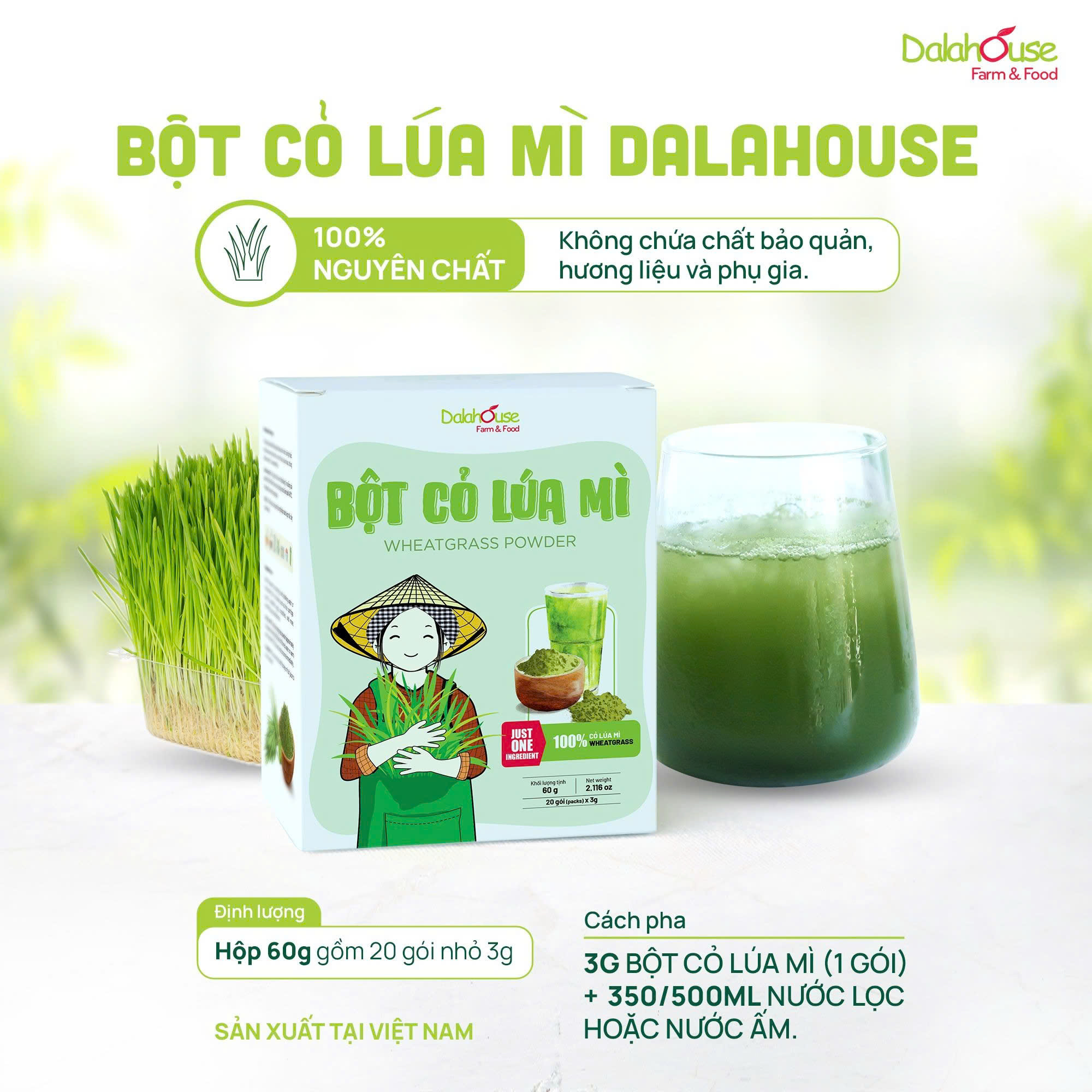 Bột Cỏ Lúa Mì Dalahouse là thực phẩm được làm từ 100% cỏ lúa mì tươi, được canh tác tại nông trại hữu cơ Dalahouse, thu hoạch tại thời điểm vàng rau giàu dinh dưỡng, sau đó được sấy lạnh bằng công nghệ hiện đại nhằm giữ trọn hương vị tự nhiên, diệp lục và các dưỡng chất có trong rau tươi.