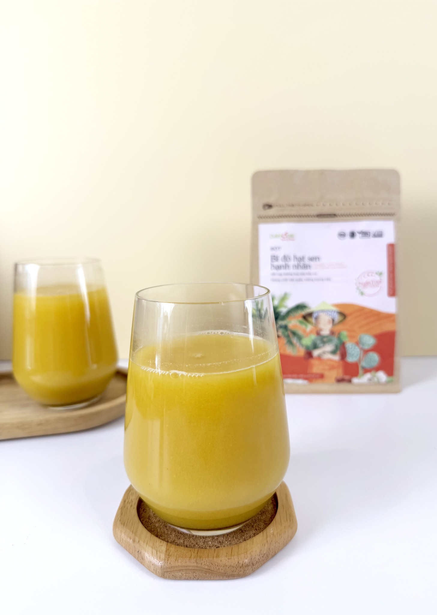 Thành phần gồm: bột bí đỏ, bột đậu xanh, bột hạt sen, sữa hạnh nhân, đường hoa dừa. Chuẩn tươi – Siêu ngon – Dinh dưỡng từ hạt và rau củ tự nhiên