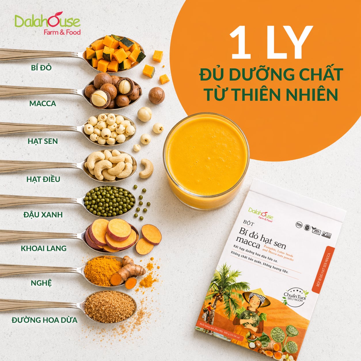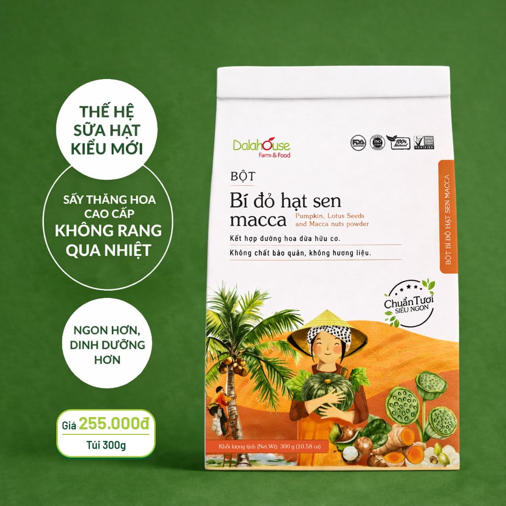 Bột Bí Đỏ Hạt Sen Macca Dalahouse là sự kết hợp hoàn hảo giữa bí đỏ ngọt dịu, hạt sen, macca và hạt điều béo bùi cùng đường hoa dừa hữu cơ, tạo nên thức uống dinh dưỡng thơm ngon và dễ tiêu hóa.