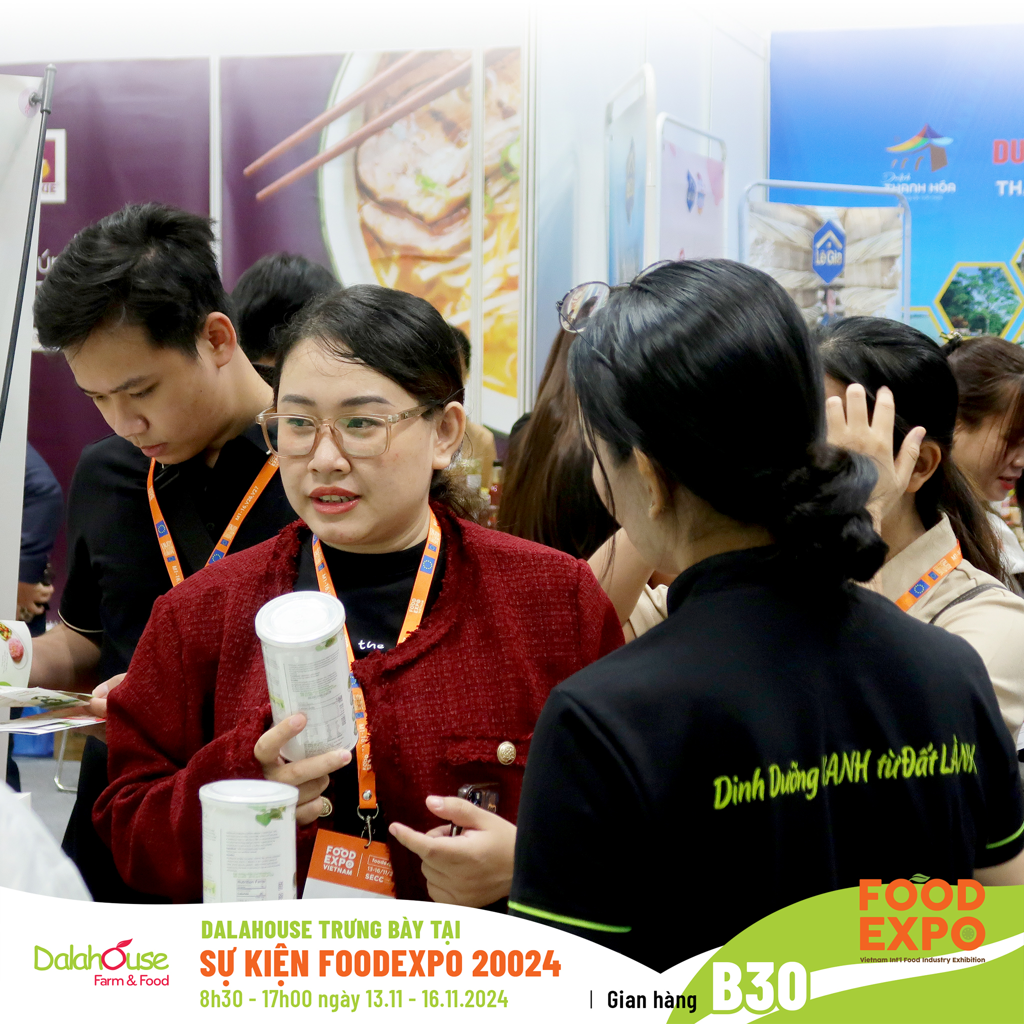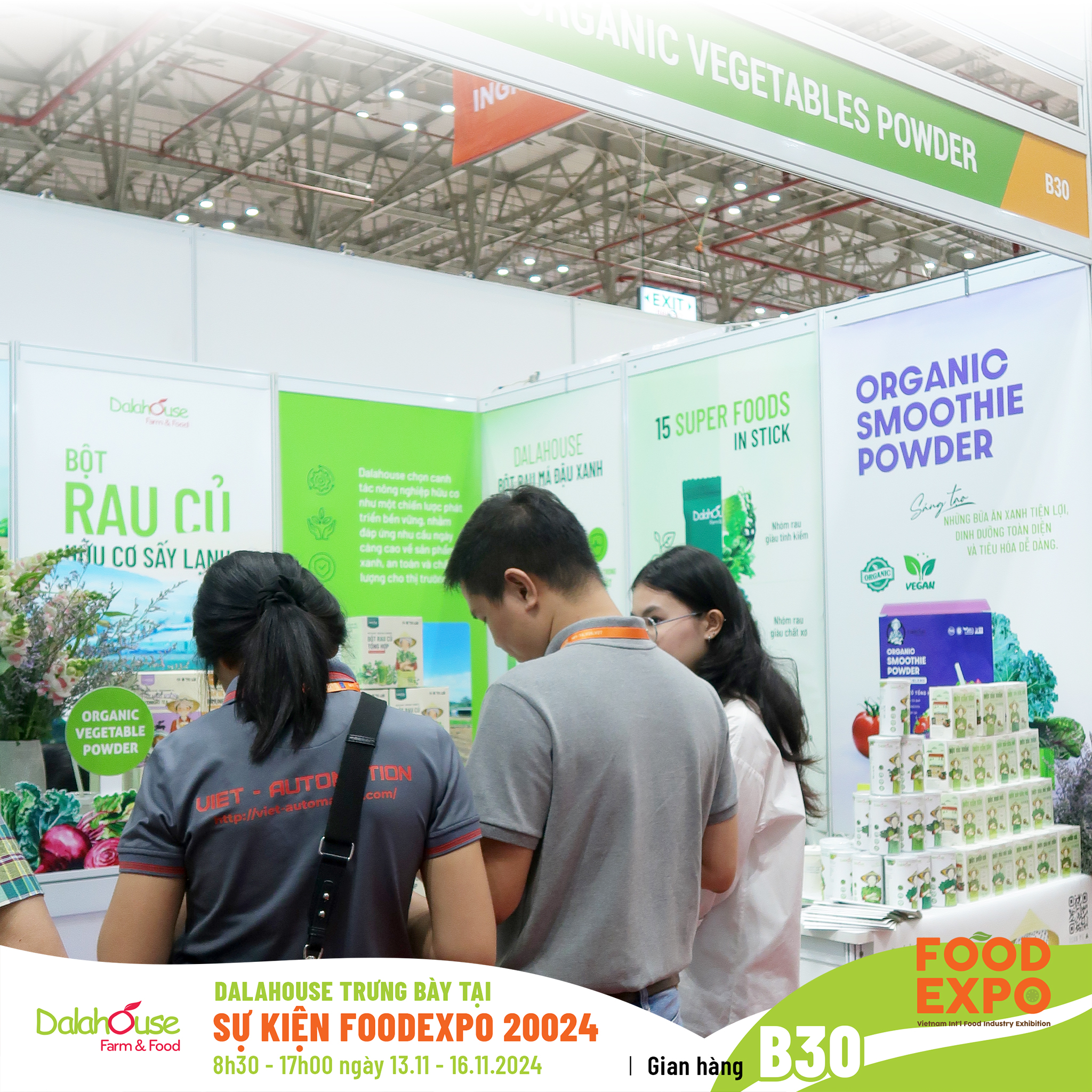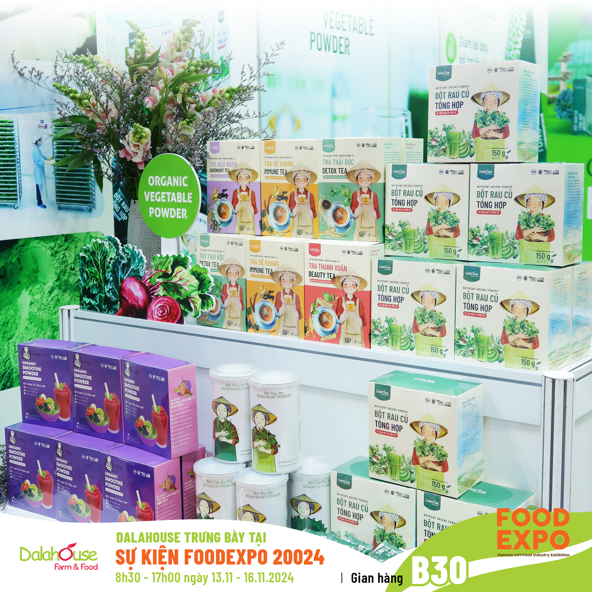Foodexpo 2024 là sự kiện thường niên lớn nhất trong ngành công nghiệp thực phẩm tại Việt Nam, nơi quy tụ các doanh nghiệp hàng đầu và những sản phẩm chất lượng cao. Dalahouse mang đến triển lãm những sản phẩm nông nghiệp hữu cơ bao gồm bột rau củ sấy lạnh và trà thảo dược lên men, đáp ứng nhu cầu tiêu dùng xanh - xu hướng đang được người tiêu dùng toàn cầu đánh giá cao.