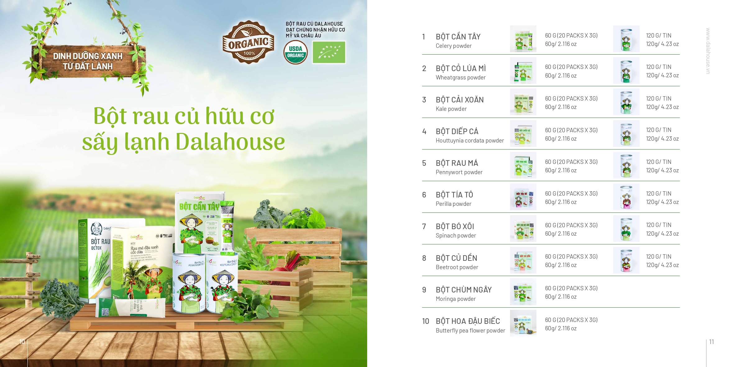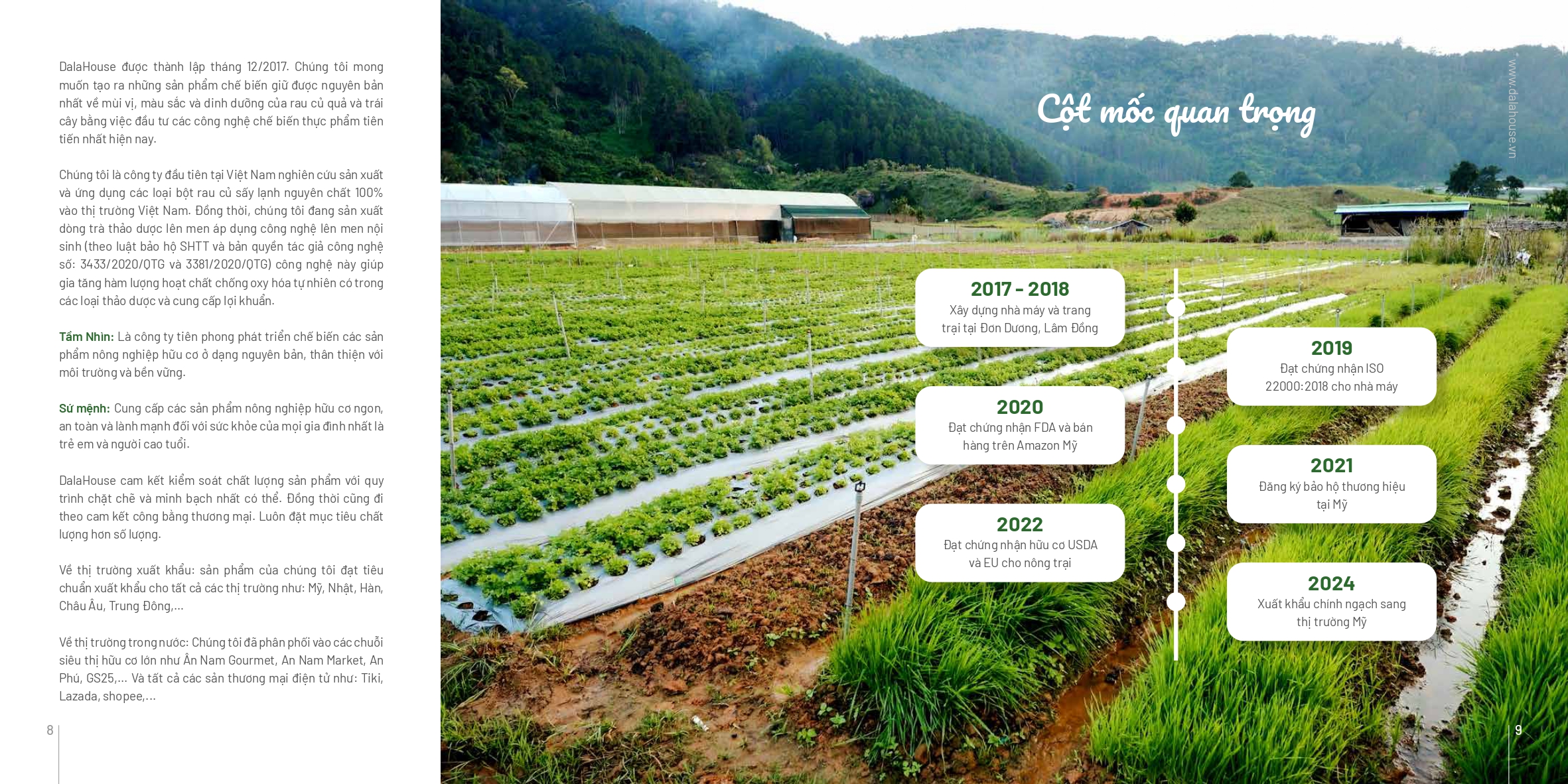 Thương hiệu Dalahouse hoạt động 07 năm trong ngành chế biến thực phẩm với dòng sản phẩm chủ lực là bột rau củ sấy lạnh và trà thảo dược lên men. Đến nay, Dalahouse sở hữu vùng nguyên liệu đạt chứng nhận hữu cơ quốc tế USDA Organic, EU Organic; nhà máy sản xuất theo quy trình khép kín đạt tiêu chuẩn ISO 22000.