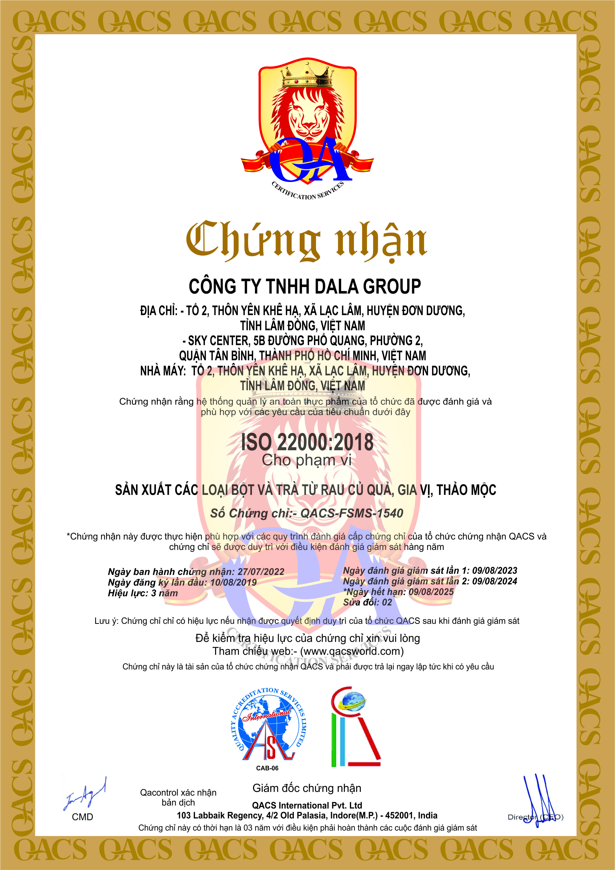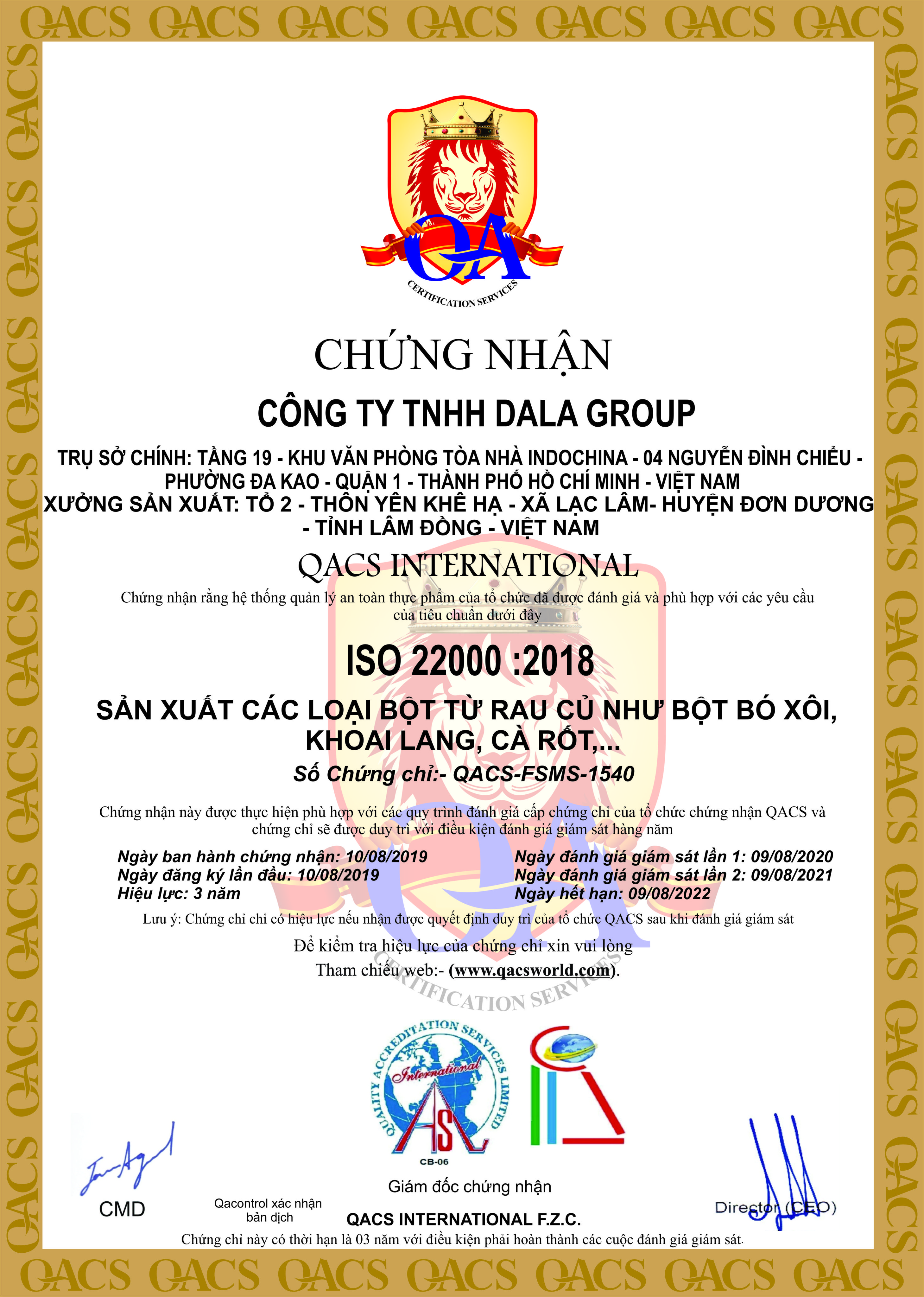 DALAHOUSE ĐẠT CHỨNG NHẬN ISO 22000:2018
