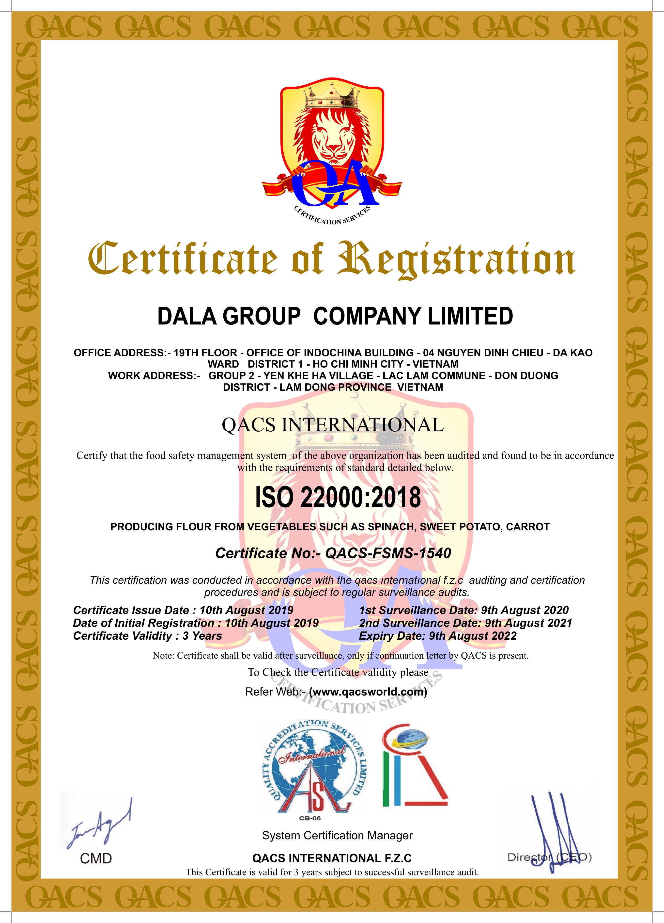 Với những nỗ lực không ngừng nghỉ nhằm mang tới cho khách hàng sản phẩm bột rau củ chất lượng và an toàn nhất. Dalahouse đã hoàn thiện hệ thống nhà xưởng và đã đạt chứng nhận ISO 22000:2018. Tên đầy đủ là ISO 22000 Food safety management systems - Requirements for any organization in the food chain (Hệ thống quản lý an toàn thực phẩm - Yêu cầu đối với các tổ chức trong chuỗi thực phẩm).