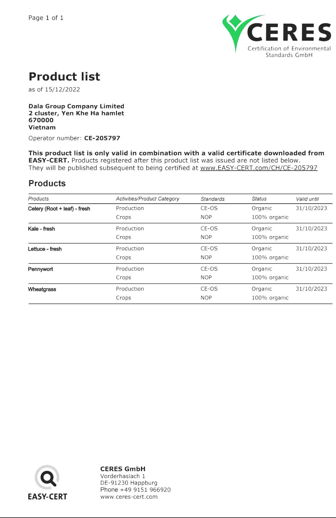 List các loại cây đạt chứng nhận USDA và EU của Dalahouse